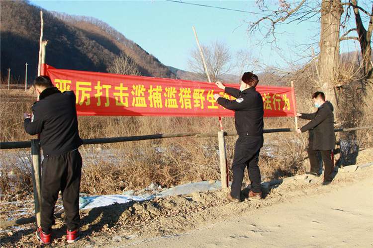冬季降雪后是非法捕猎野生动物的高峰期。为落实省林草局关于切实做好候鸟及野生动物禽流感监测防控工作具体要求,联合行动组在闹枝林场巡山管护人员的引领下,深入候鸟及野生动物活动频繁区域、迁徙通道及停歇地展开了拉网式排查,对可能安装捕猎工具的树根下、密草丛、积雪处等重点部位进行了仔细搜索,对行动中发现的猎套、粘网、兽夹等非法猎捕工具进行当场拆除处理。为保证行动不走过场,威慑常在,行动组还在入山道口、管护站前悬挂了野生动物保护宣传条幅,引导辖区居民群众自觉摒弃滥食野生动物陋习,抵制非法交易活动。